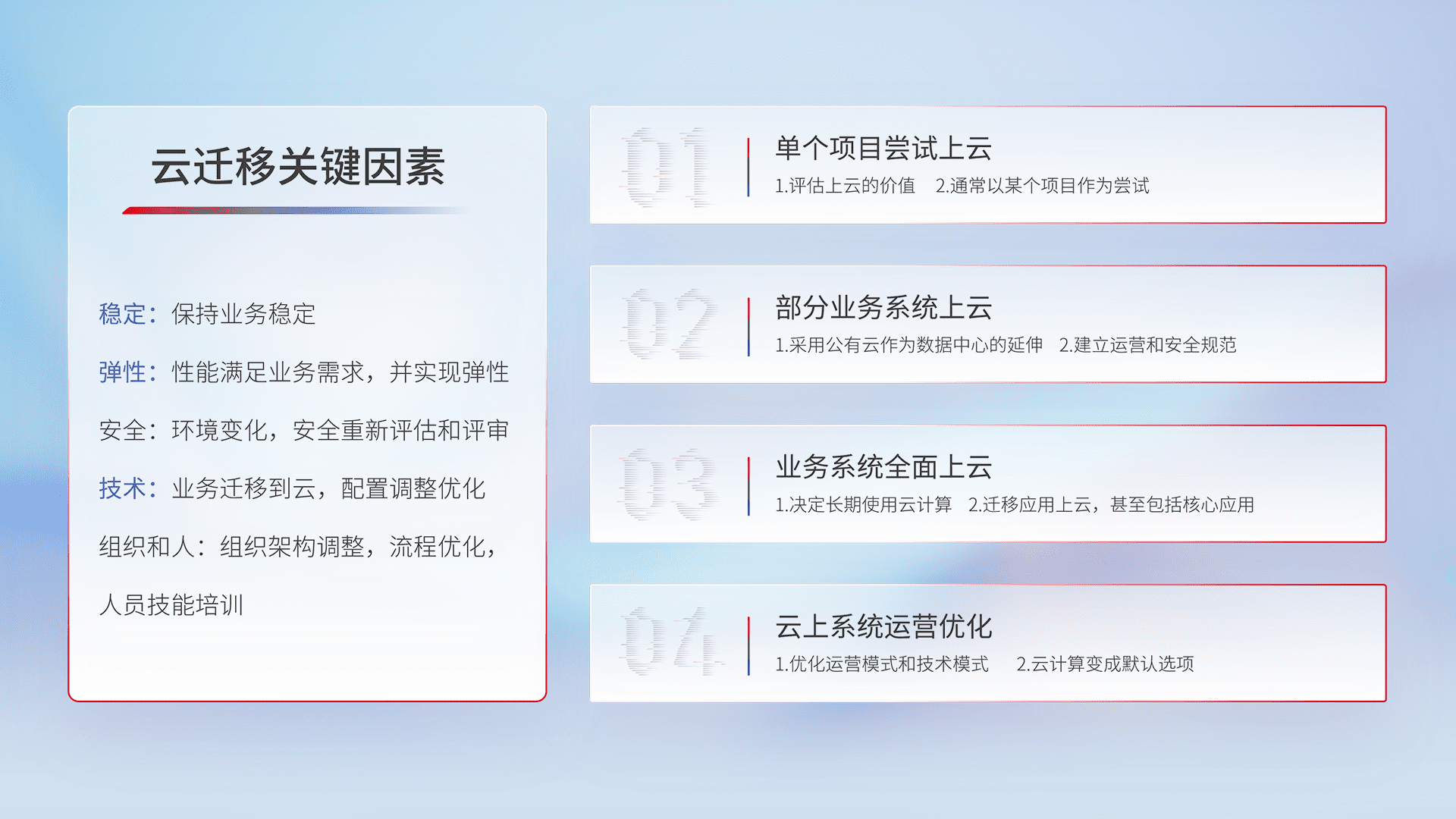 结合实际业务,,,,从规划设计、、、、云平台选型、、、云原生改造、、、、数据迁移、、、、集成交付,,,,迁移全过程为客户识别最佳上云路径,,,,做好风险识别管理,,,,设计网络架构、、身份权限、、、安全审计合规、、、操作审计、、日志审计、、、监控告警策略、、、多站点容灾设计等,,,对云上基础设施进行整体规划,,提升IT治理水平,,,,以满足弹性、、高可用、、、高性能的需求。。